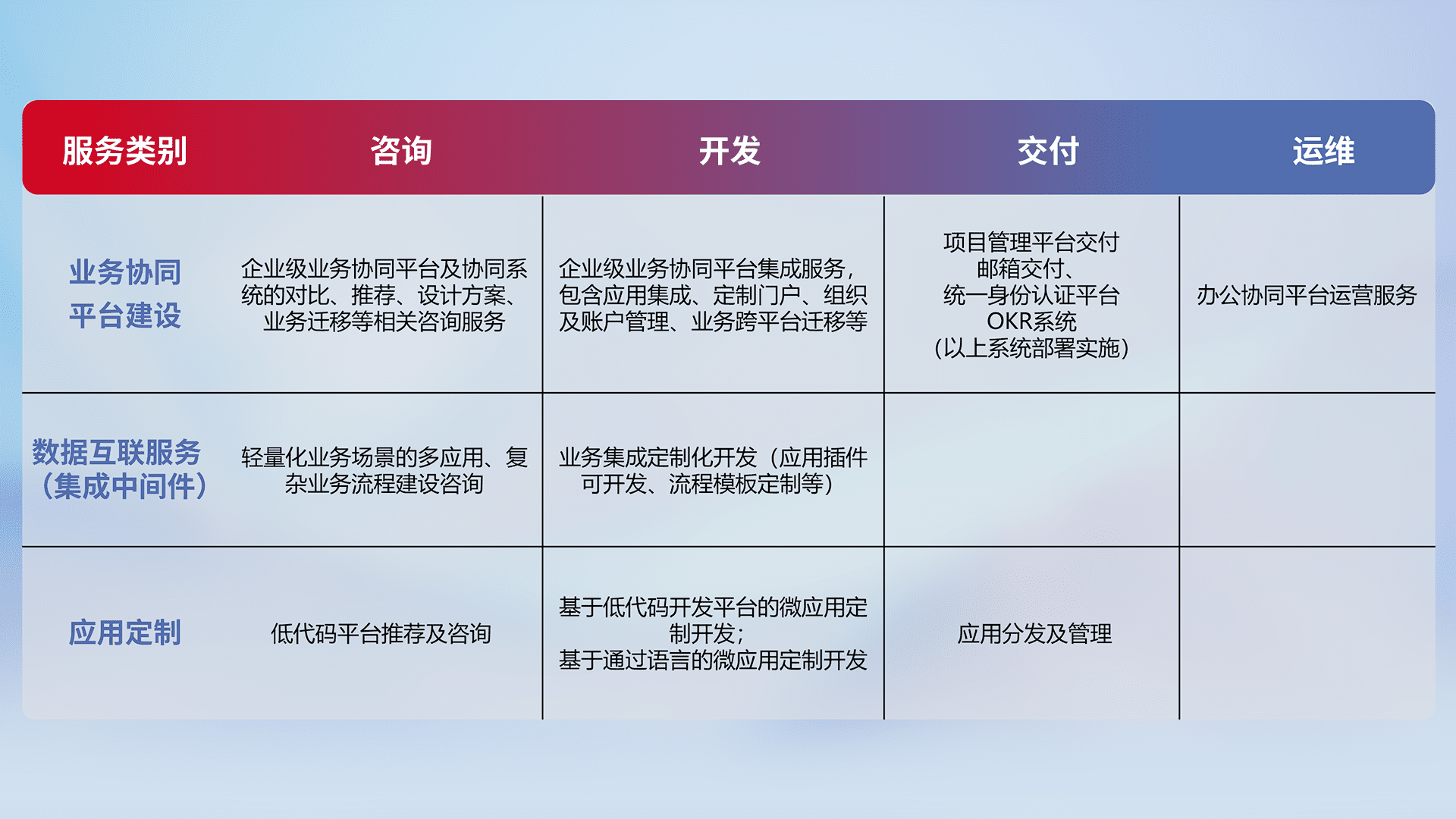 针对钉钉、、、、企微、、IDaas等平台级产品提供产品的规划、、、、方案、、交付、、、定制化开发等服务,,,实现如统一协同办公、、、智能客户服务、、、混合会议管理、、智能数据查询、、、等业务场景,,,实现数字化转型。。。